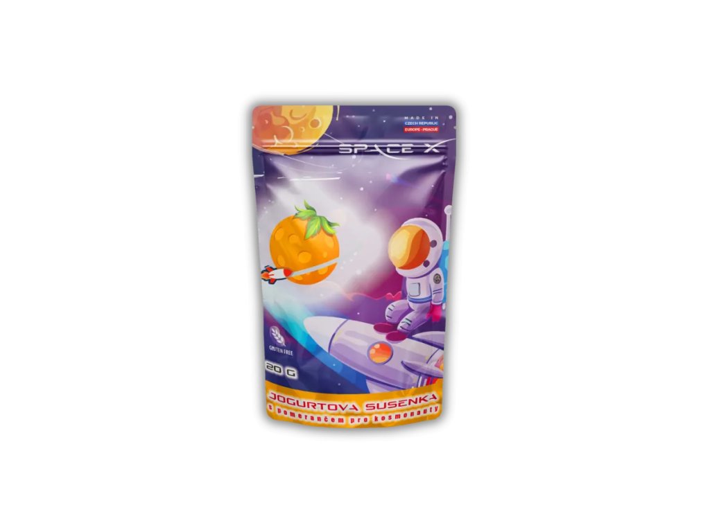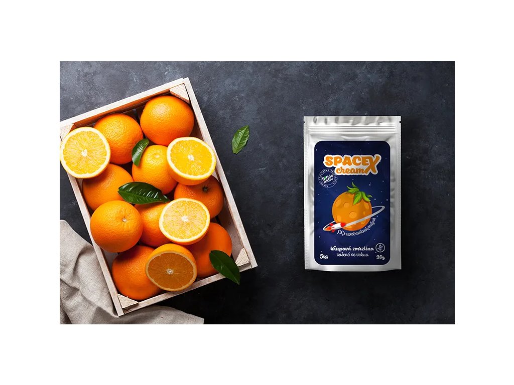 Složení: Lyofilizovaný jogurt (mléko, smetana, sušené mléko, jogurtová a probiotická kultura), cukr, lyofilizovaný pomeranč.